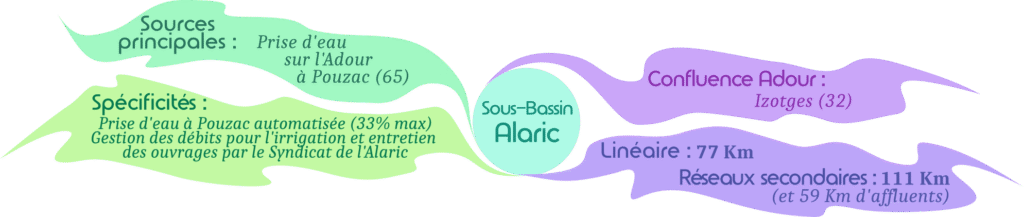 Le Canal de l’Alaric est capté sur la rive droite de l’Adour, au Seuil d’Alaric à Pouzac. Il est dimensionné pour écouler un débit maximal de 1500 l/s soit 1/3 du débit moyen de l’Adour. Son cours, parallèle à celui de l’Adour, contourne l’agglomération tarbaise par l’Est. Puis, il rejoint l’Arros dans le Gers.